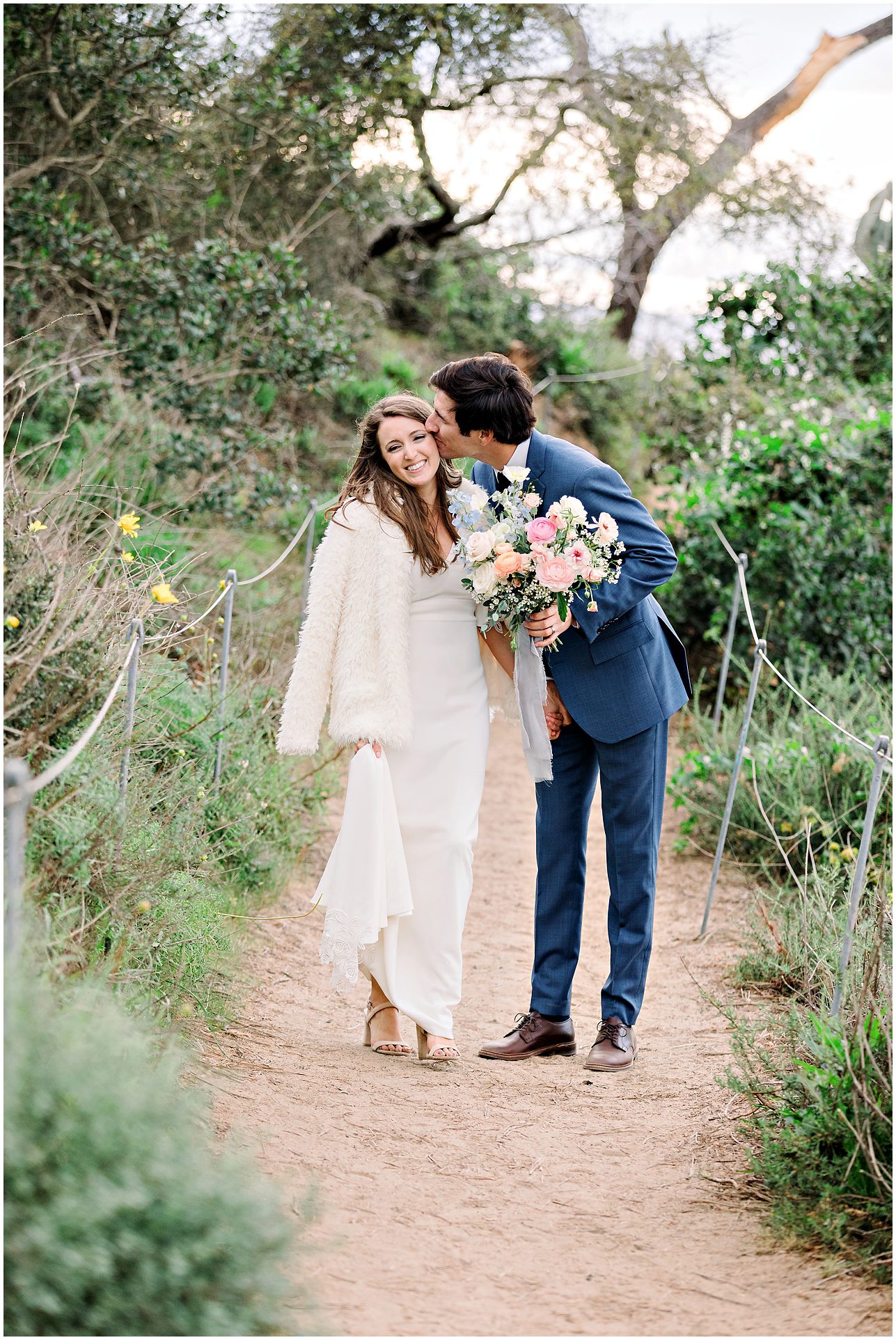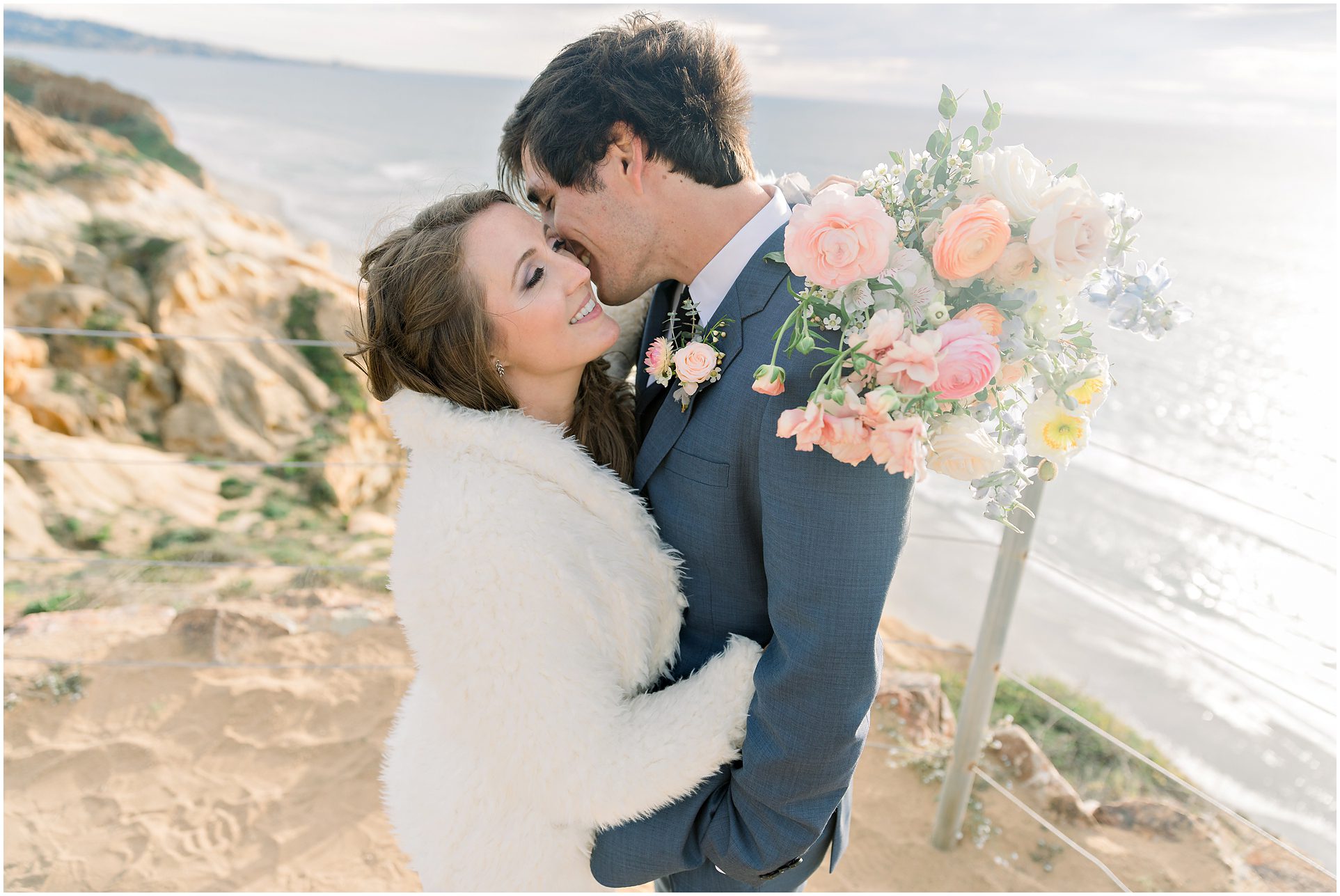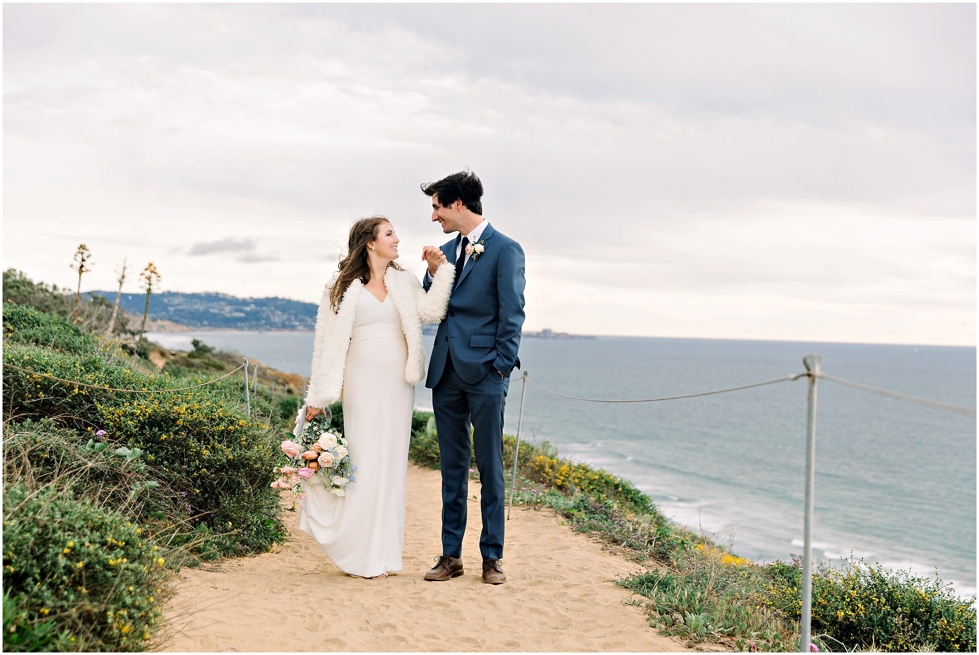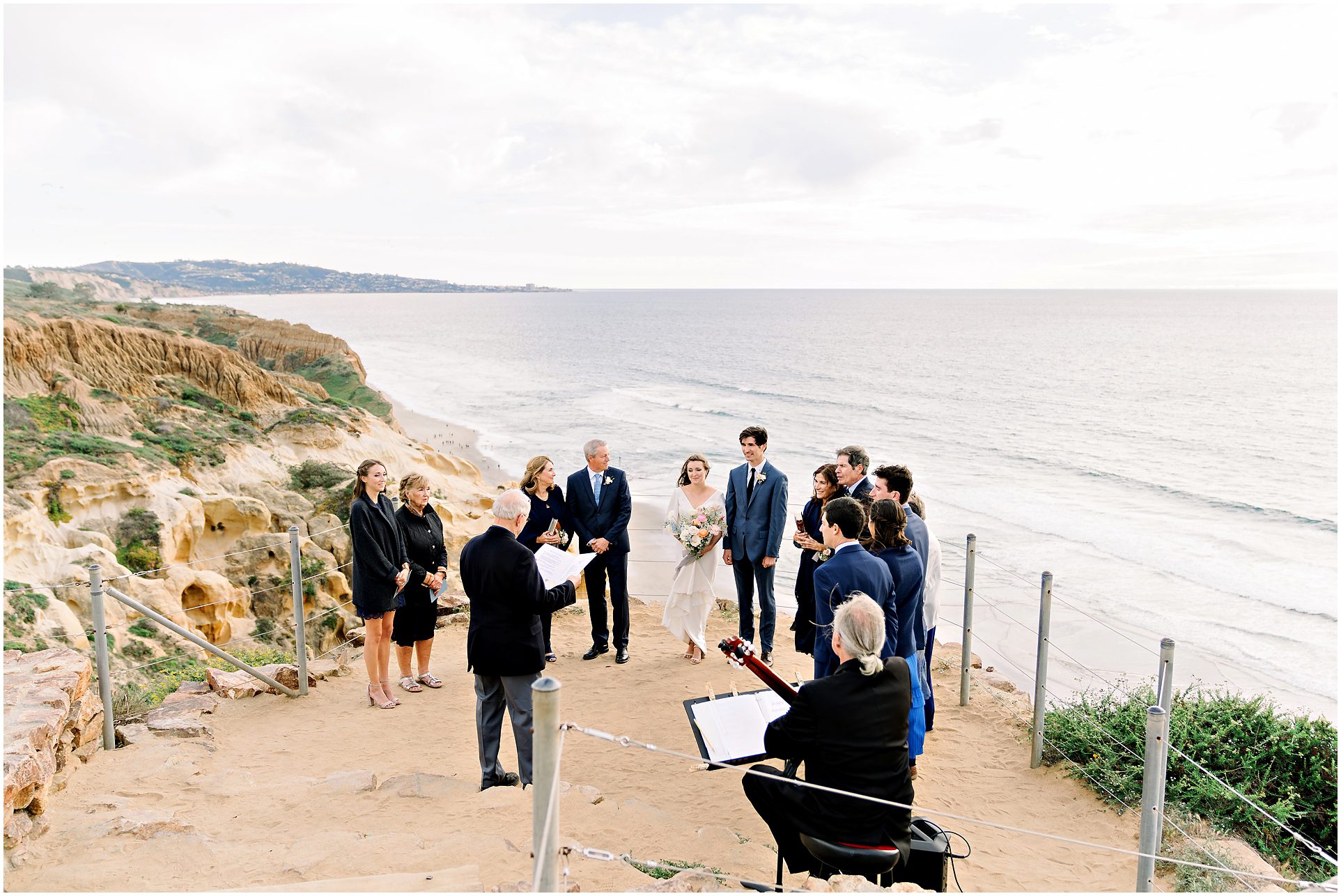 I am not exaggerating when I say that the light at Torrey Pines State Park was the most beautiful I have ever seen it on this wedding day! At first it looked like rain, and then the clouds turned magical. For a Spring wedding at Torrey Pines State Park, I don’t think I’ve ever seen it prettier. Spring weddings are my favorite because everything is so green and beautiful. Flowers are blooming and the skies are filled with gorgeous puffy clouds. I loved the intimacy of this small wedding on a clifftop overlooking the ocean in Southern California…